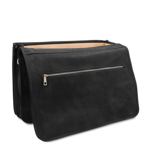 Type: Briefcase - Composition: Matte full grain hand stained vegetable tanned leather, Natural lining - Features: Semi-rigid structure, 2 compartments - Outside part: Pocket on the back side, Metal rectangle Tuscany Leather logo, 2 front pockets with closure - Inside part: Open pocket, Keyring attachment, Credit card pockets, 2 Pen pockets - Shoulder strap: Detachable and adjustable leather shoulder strap - Format: Can hold a 17" Laptop - Hardware: Silver-tone hardware, Brushed brass-tone hardware, YKK metal zips - Closure: Snap button closure - Accessories: Dust Bag