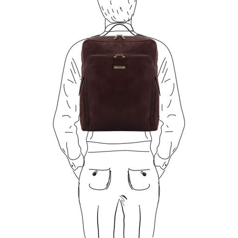 Composition: Matte full grain hand stained vegetable tanned leather, Cotton lining - Features: Semi-rigid structure, 1 compartment - Outside part: Metal rectangle Tuscany Leather logo, Trolley sleeve to attach to rolling suitcase, Front pocket with closure, Pocket on the back side with closure - Inside part: Keyring attachment, Internal laptop pocket, Credit card pockets, Zip pocket, 2 open pockets, Internal padded partition, Central laptop compartment, Pen holder - Shoulder strap: Adjustable leather shoulder straps - Format: Can fit A4 format, Can hold a 17" Laptop - Hardware: YKK metal zips , Brushed brass-tone hardware - Closure: Zip closure on three sides, Closure with buckle - Accessories: Dust Bag