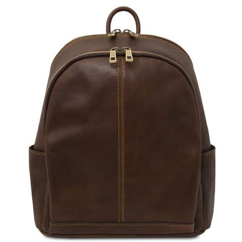Composition: Matte full grain hand stained vegetable tanned leather, Cotton lining - Features: Semi-rigid structure, 2 compartments - Outside part: 2 open pockets on the sides, Hot-stamping with Tuscany Leather logo, Pocket on the back side with closure - Inside part: Zip pocket, 2 open pockets - Shoulder strap: Adjustable leather shoulder straps - Hardware: Silver-tone hardware, Brushed brass-tone hardware - Closure: Zip closure - Accessories: Dust Bag