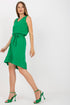 Summer dress with a flared cut without sleeves. The dress has an asymmetrical hem decorated with a ruffle, and a sweetheart neckline. The waist is additionally tied at the waist.