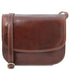 Type: Saddle Bag - Composition: Full grain hand stained vegetable tanned leather, Natural lining - Features: Rigid structure, 3 compartments - Outside part: Hot-stamping with Tuscany Leather logo, Pocket on the back side with closure - Inside part: Zip pocket, Central Zipped compartment - Shoulder strap: Adjustable leather shoulder strap - Hardware: Brushed brass-tone hardware, Silver-tone hardware - Closure: Magnetic button closure - Accessories: Dust Bag