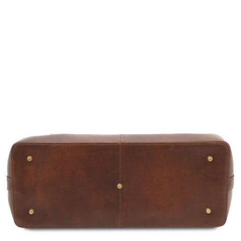 Composition: Soft full grain leather , Polyester lining - Features: Semi-rigid structure, 2 compartments - Outside part: Hot-stamping with Tuscany Leather logo - Inside part: Zip pocket, Central Zipped compartment - Shoulder strap: Detachable and adjustable leather shoulder strap -...