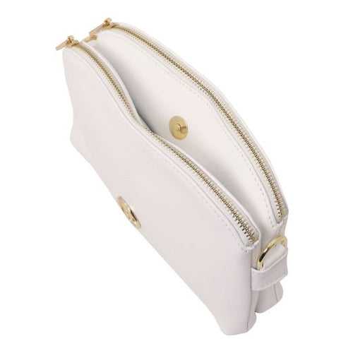 Composition: Soft full grain leather , Polyester lining - Features: Semi-rigid structure, 2 compartments - Outside part: Hot-stamping with Tuscany Leather logo - Inside part: Zip pocket, Central Zipped compartment - Shoulder strap: Detachable and adjustable leather shoulder strap -...