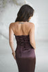 An elegant dress made of shiny satin, strapless, adorned with a large, draped rose placed on the bust. The fitted cut emphasizes the silhouette, while the high slit on the leg adds lightness and feminine charm. Perfect for special occasions and evening outings. The dress is fastened with a concealed zipper, making it easy to put on and take off the outfit.