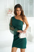 Mini dress with beautiful sequin sleeves on one shoulder. The top is asymmetrical, also with a sequin insert. The bottom of the creation is short, smooth and crinkled. The dress has a lining, fastened with a covered zipper. The dress is ideal for elegant events.