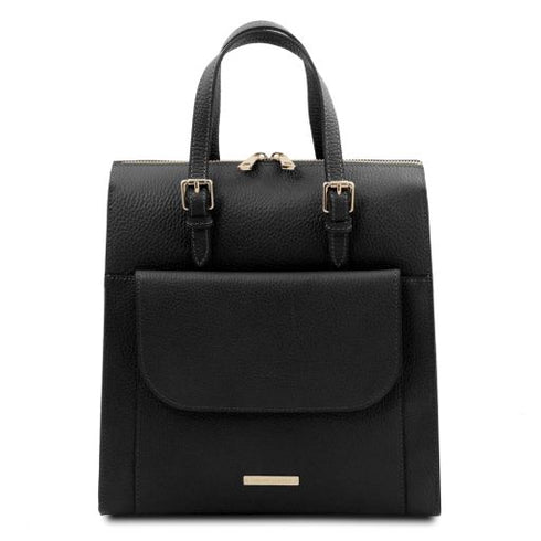 Type: Backpack - Composition: Pebbled leather, Polyester lining - Features: Semi-rigid structure, 1 compartment - Outside part: Metal rectangle Tuscany Leather logo, Front pocket with closure - Inside part: Zip pocket, 2 open pockets - Shoulder strap: Detachable and adjustable leather shoulder straps - Format: Can fit A4 format - Hardware: Gold-tone hardware - Closure: Zip closure, Magnetic button closure - Handles: Leather adjustable and detachable handle - Accessories: Dust Bag