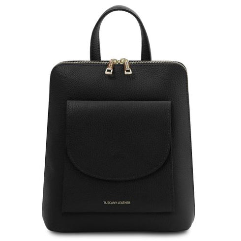 Type: Backpack - Composition: Pebbled leather, Polyester lining - Features: Semi-rigid structure - Outside part: Gold hot-stamping with Tuscany Leather logo, Front pocket with closure, Pocket on the back side with closure - Inside part: Open pocket, Zip pocket, Central Zipped compartment - Shoulder strap: Adjustable leather shoulder straps - Hardware: Gold-tone hardware - Closure: Zip closure - Accessories: Dust Bag