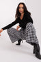 Casual style high-waisted fabric pants with waist tie and slip pockets. Pants with wide legs made of material in gray-black color. A proposition for many occasions.
