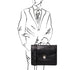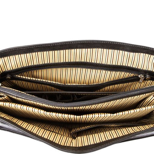 Type: Briefcase - Composition: Matte full grain hand stained vegetable tanned leather, Cotton lining, Pigskin lining - Features: Semi-rigid structure, 4 compartments, Provided with TL SMART CONNECT system, Shock absorbent - Outside part: Trolley sleeve to attach to rolling suitcase, Front pocket with closure, Pocket on the back side with closure - Inside part: Internal laptop pocket, Zip pocket, 2 open pockets, Central laptop compartment, Pen holder - Shoulder strap: Detachable and adjustable leather shoulder strap, Wide leather and cloth shoulder strap - Hardware: YKK metal zips , Brushed brass-tone hardware, Silver-tone hardware - Closure: Metal push-lock clasp with key and engraved Tuscany Leather logo - Accessories: Dust Bag, TL SMART MODULE