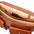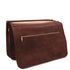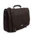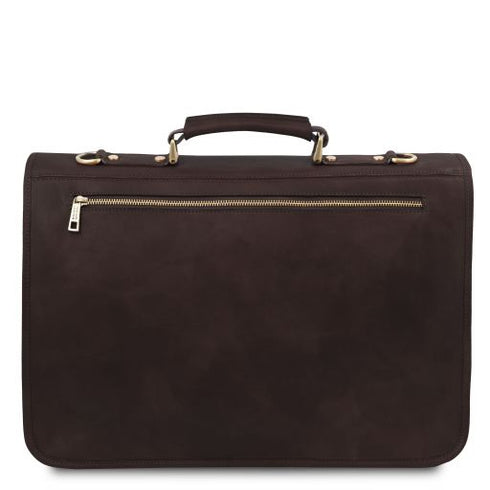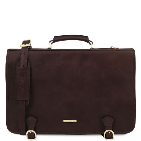 Type: Briefcase - Composition: Matte full grain hand stained vegetable tanned leather, Natural lining - Features: Semi-rigid structure, 2 compartments - Outside part: Pocket on the back side, Metal rectangle Tuscany Leather logo, 2 front pockets with closure - Inside part: Open pocket, Keyring attachment, Credit card pockets, 2 Pen pockets - Shoulder strap: Detachable and adjustable leather shoulder strap - Format: Can hold a 17" Laptop - Hardware: Brushed brass-tone hardware, YKK metal zips , Silver-tone hardware - Closure: Snap button closure - Accessories: Dust Bag