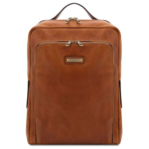 Composition: Matte full grain hand stained vegetable tanned leather, Cotton lining - Features: Semi-rigid structure, 1 compartment - Outside part: Metal rectangle Tuscany Leather logo, Front pocket with closure, Pocket on the back side with closure - Inside part: Credit card pockets, Zip pocket, 2 open pockets, Pen holder - Shoulder strap: Adjustable leather shoulder straps - Format: Can fit A4 format, Can hold a 13.3'' laptop - Hardware: Brushed brass-tone hardware, Silver-tone hardware, YKK metal zips - Closure: Zip closure on three sides - Accessories: Dust Bag
