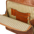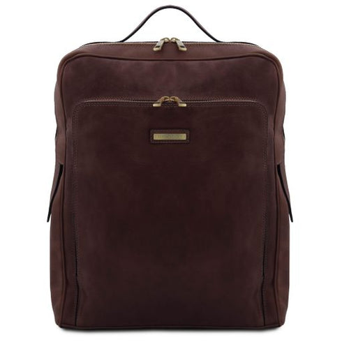 Composition: Matte full grain hand stained vegetable tanned leather, Cotton lining - Features: Semi-rigid structure, 1 compartment - Outside part: Metal rectangle Tuscany Leather logo, Trolley sleeve to attach to rolling suitcase, Front pocket with closure, Pocket on the back side with closure - Inside part: Keyring attachment, Internal laptop pocket, Credit card pockets, Zip pocket, 2 open pockets, Internal padded partition, Central laptop compartment, Pen holder - Shoulder strap: Adjustable leather shoulder straps - Format: Can fit A4 format, Can hold a 17" Laptop - Hardware: YKK metal zips , Brushed brass-tone hardware - Closure: Zip closure on three sides, Closure with buckle - Accessories: Dust Bag