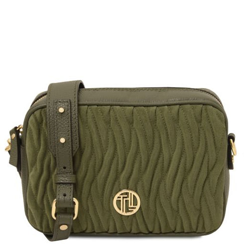 Type: Crossbody Bag - Composition: Pebbled leather, Suede leather, Polyester lining - Features: Semi-rigid structure, 1 compartment - Outside part: Metal TL logo, Protective metal feet on the bottom - Inside part: Open pocket, Zip pocket - Shoulder strap: Detachable and adjustable leather shoulder strap - Hardware: Gold-tone hardware - Closure: Zip closure - Accessories: Dust Bag