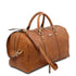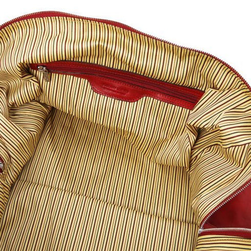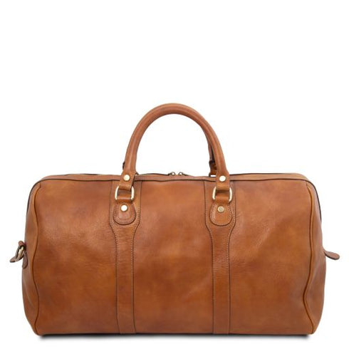 Type: Weekend Bag - Composition: Matte full grain hand stained vegetable tanned leather, Cotton lining - Features: Soft structure, 1 compartment - Outside part: Metal rectangle Tuscany Leather logo, Protective metal feet on the bottom - Inside part: Zip pocket, 2 open pockets - Shoulder strap: Detachable and adjustable leather shoulder strap - Hardware: Brushed brass-tone hardware, Silver-tone hardware, YKK metal zips - Closure: Zip closure - Accessories: Dust Bag