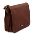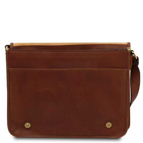 Type: Messenger - Composition: Matte full grain hand stained vegetable tanned leather, Pigskin lining - Features: Soft structure, 2 compartments - Outside part: Metal rectangle Tuscany Leather logo, Pocket on the front side, Pocket on the back side with closure - Inside part: Open pocket, Credit card pockets, Zip pocket, Pen holder - Shoulder strap: Adjustable leather shoulder strap - Format: Can fit A4 format - Hardware: Brushed brass-tone hardware, Silver-tone hardware - Closure: Magnetic button closure - Accessories: Dust Bag