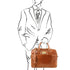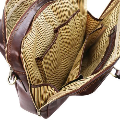 Type: Briefcase - Composition: Full grain hand stained vegetable tanned leather, Cotton lining - Features: Soft structure, 2 compartments - Outside part: Metal rectangle Tuscany Leather logo, Trolley sleeve to attach to rolling suitcase, Protective metal feet on the bottom, Front pocket with closure - Inside part: Keyring attachment, Internal laptop pocket, Credit card pockets, Zip pocket, 2 open pockets, 2 Pen pockets, Internal padded partition - Shoulder strap: Detachable and adjustable leather shoulder strap - Format: Can fit A4 format, Can hold a 15.6" laptop - Hardware: Brushed brass-tone hardware, Silver-tone hardware - Closure: Zip closure - Accessories: Dust Bag
